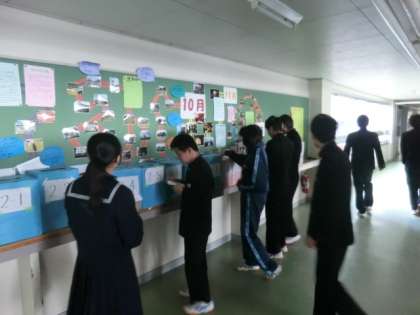 画像は、仕分けしている生徒の様子と生徒玄関前のポストに投函する生徒の様子です。
