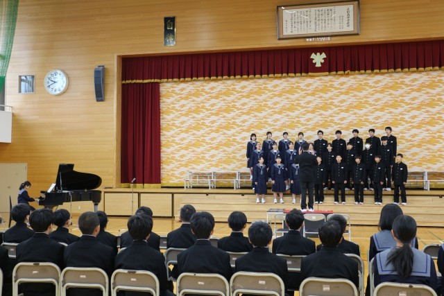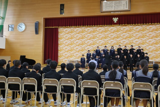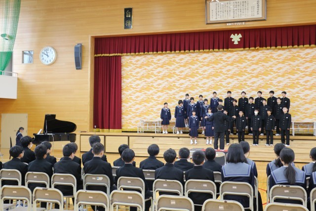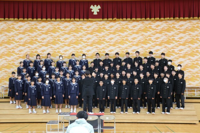 10月21日に1年生は合唱コンクールのリハーサルを行いました。入退場の仕方や並ぶ位置などを確認した後、それぞれのクラスの合唱を聞き合いました。