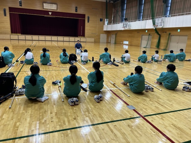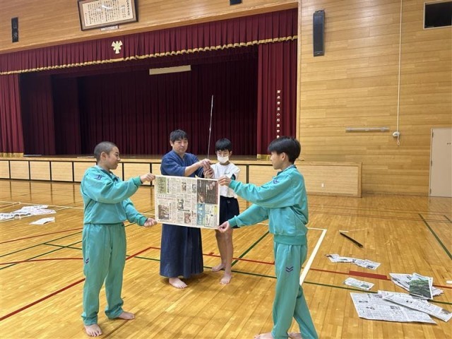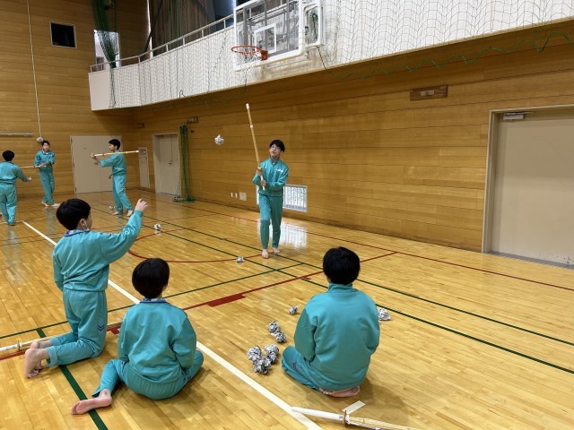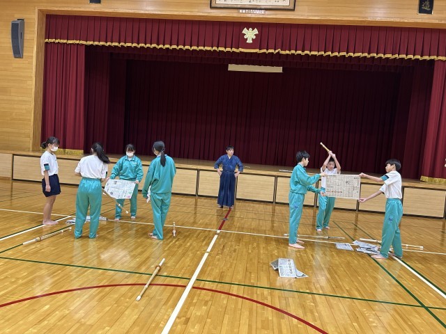 体育の授業では剣道と柔道のどちらかを生徒が選択して行っています。剣道では専門の先生を県から派遣していただき授業をしています。