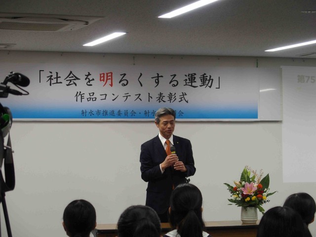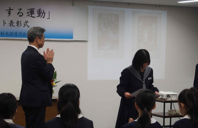 ポスター部門で優秀作品に入賞した生徒が市長から賞状を授与されました。