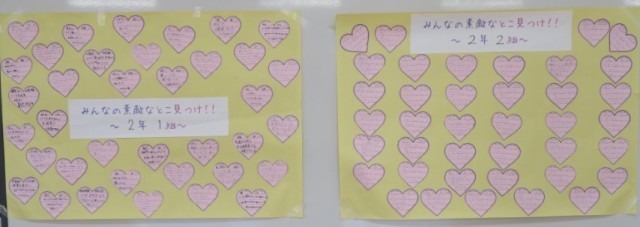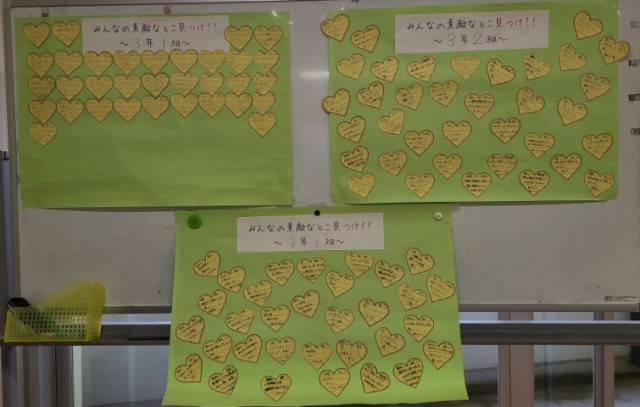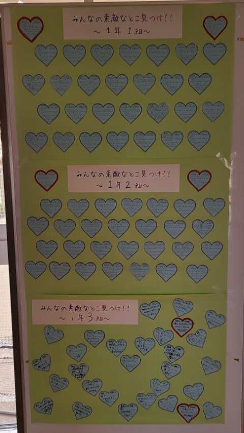 クラスの人の素敵なところをお互いに見付けてカードに書き、各階のマルチスペースに掲示しています。