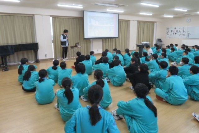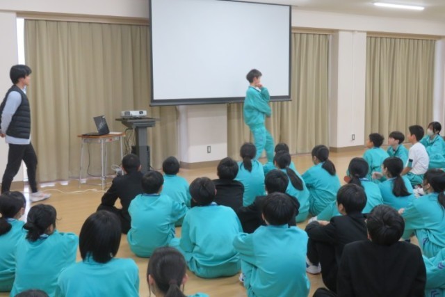 今日は、体育の先生から空手についての事前学習を行ました。実際に空手を習っている生徒も見本をみせてくれました。