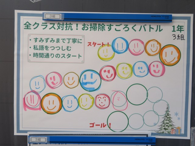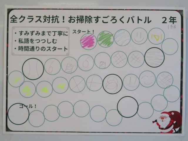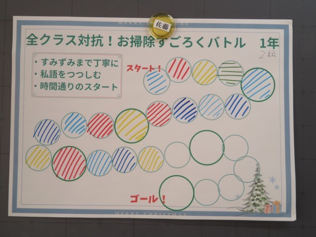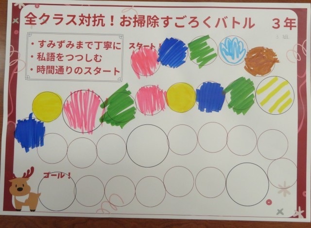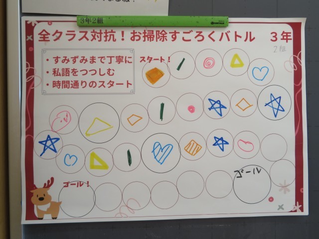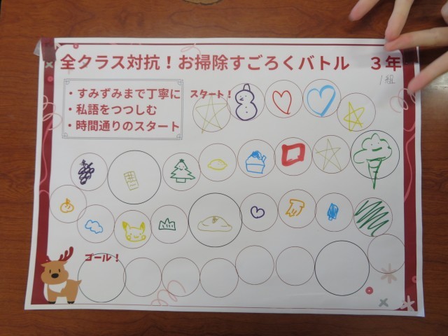 美化委員会では、班員全員が協力して、楽しみながら掃除をする意識を高めるために「お掃除すごろくバトル」を行いました。