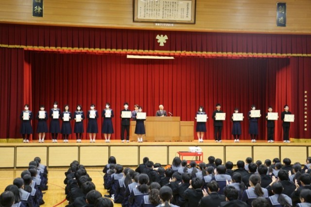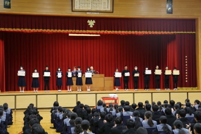 12月24日に授賞集会を行いました。今回の受賞者には、富山県統計グラフコンクールで県知事賞を受賞した生徒や全国の防火防災に関する作文コンクールで佳作に輝いた生徒が受賞されました。