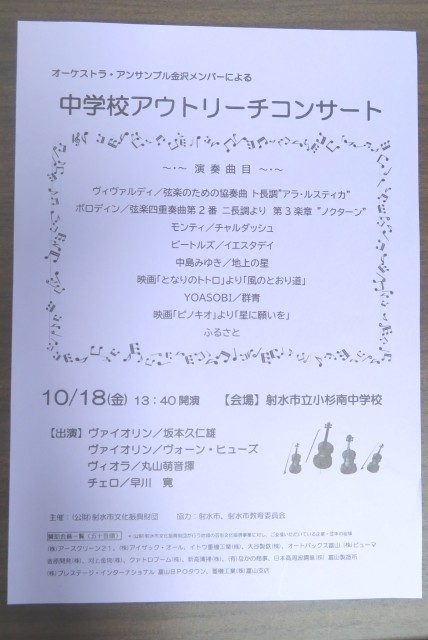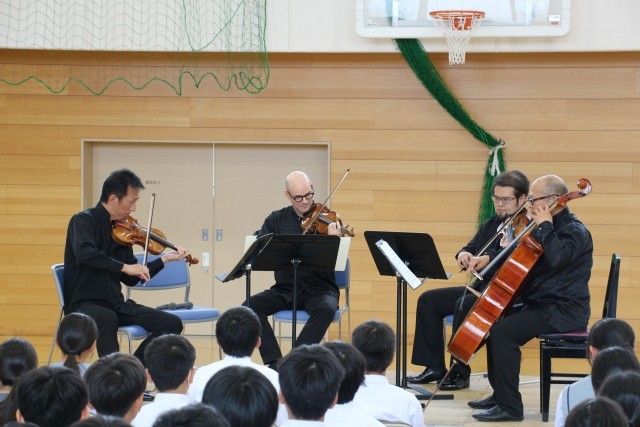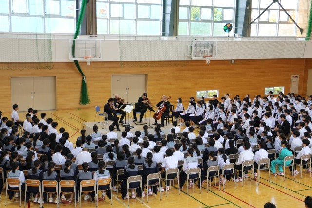 今日の午後、オーケストラ・アンサンブル金沢の弦楽器を担当する4名のメンバーが来校され、アウトリーチコンサートを開催してくださいました。クラッシックの落ち着いた曲や誰もが知っているアニメの曲等、いろいろなジャンルの曲を演奏くださり、生徒はその美しい音色に引き込まれ、真剣に聴き入っていました。全校で貴重なひとときを過ごすことができました。