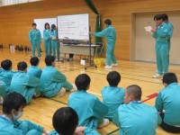 12月19日に2年生は日本赤十字社の方から心肺蘇生法を習いました。胸骨圧迫、救急車要請、AEDを取りに行くといった役割を分担して、それぞれのグループで実践を行いました。