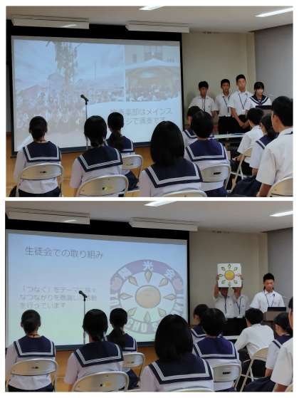 本日、夏季連合生徒協議会が志貴野中学校で行われています。プログラム1番は学校紹介でした。生徒会の代表4名が戸出中学校の特徴やよさを分かりやすく発表しました。