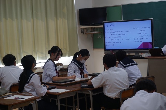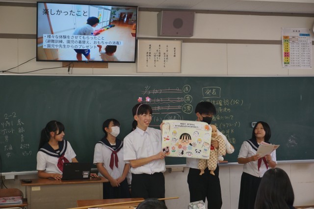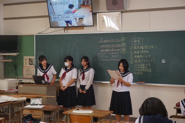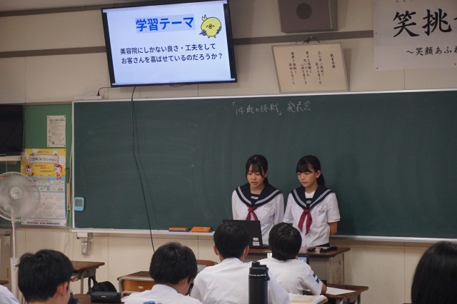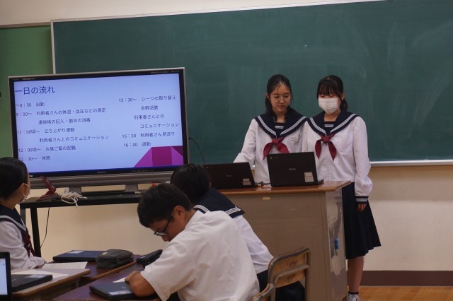 2年生の総合的な学習の時間では、14歳の挑戦で学んだことについて事業所ごとに発表会を行いました。1日の仕事のスケジュールや業務内容、やりがいや大変だったこと等についてプレゼンテーションソフトを活用して発表し合いました。どの事業所も発表内容がしっかりとまとめられており、聞きごたえがありました。