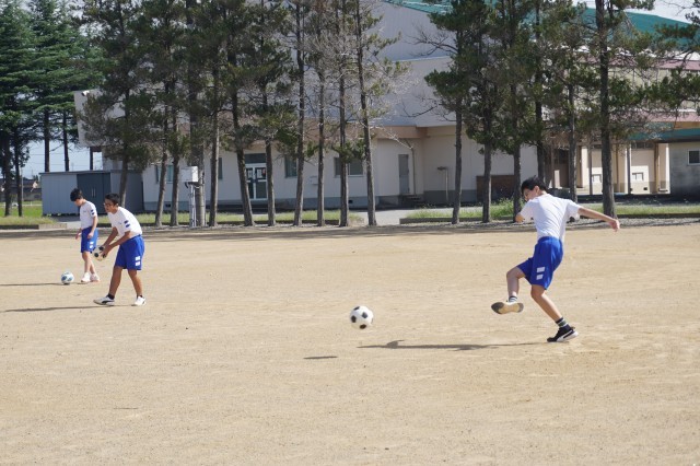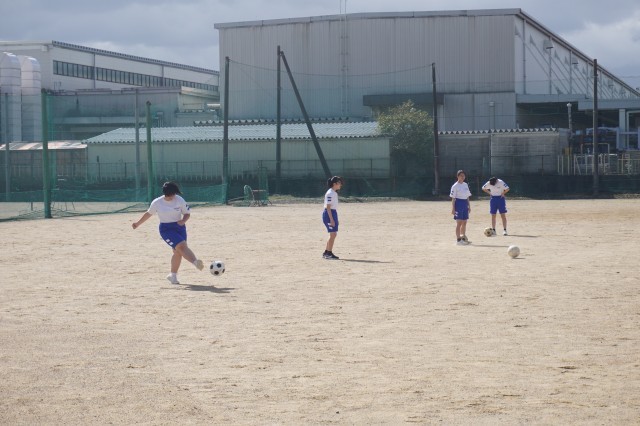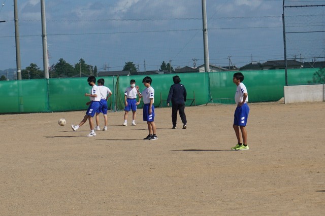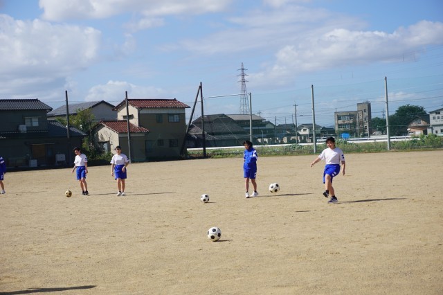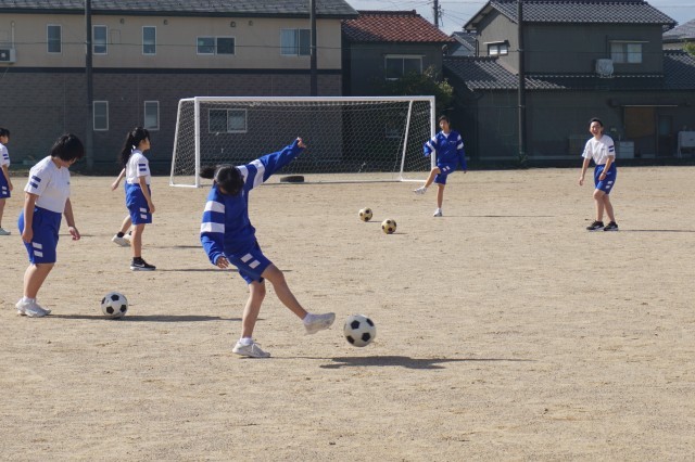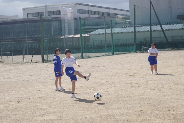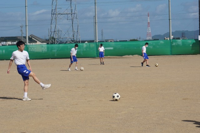 3年生の体育では、サッカーの授業が行われていました。2人組になり、ボールを「止める」「蹴る」という基本的な技能の向上を目指しました。爽やかな秋晴れの下、生徒たちは楽しく活動に取り組んでいました。