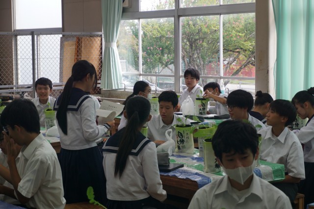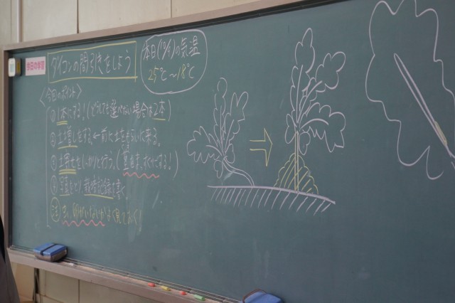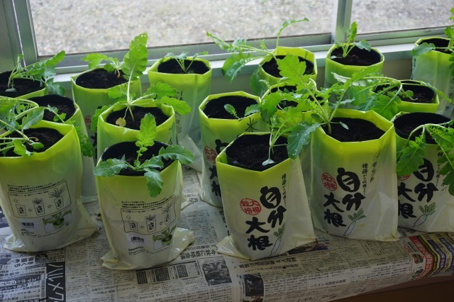 2年生の技術・家庭科では、大根の栽培・観察を行っています。今日は、発芽した大根の間引きを行い、苗を1本にしました。立派な大根に育つといいですね。