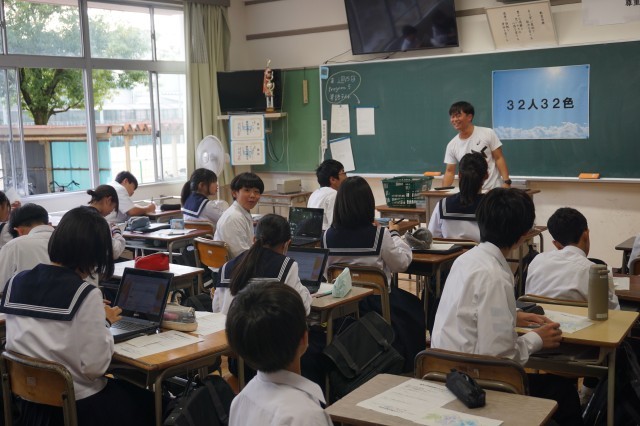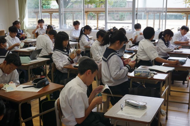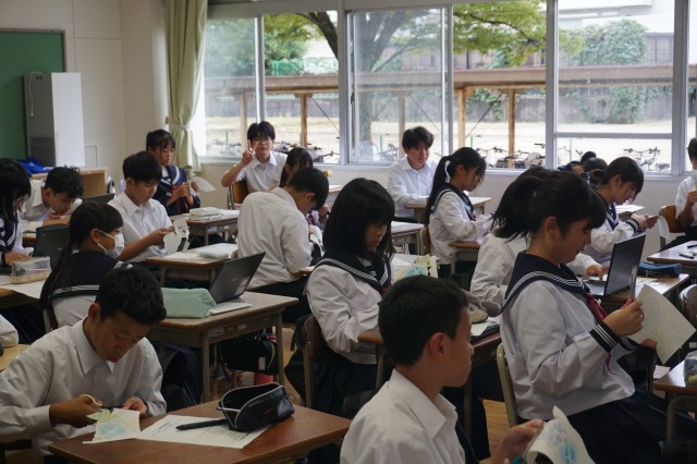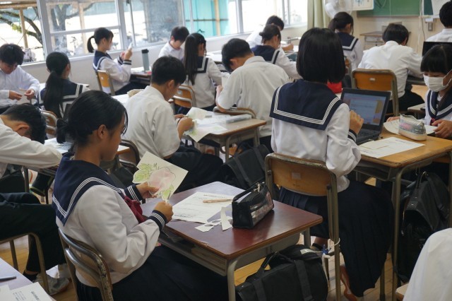 1年生の学級活動では、合唱コンクールに向けて、各自が頑張りたい目標について書きました。書いた目標は、1枚の模造紙にまとめて貼り付けて掲示します。