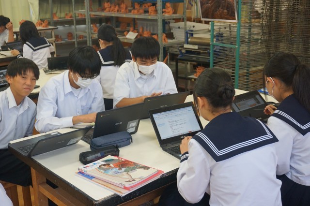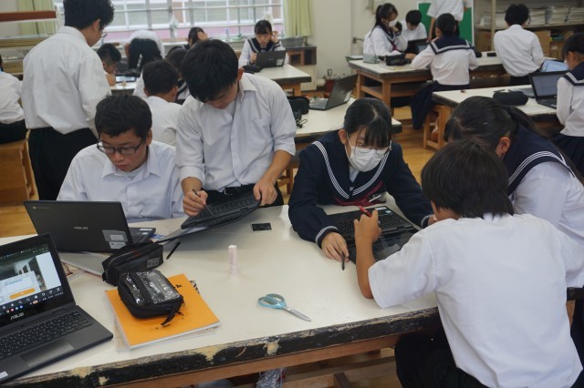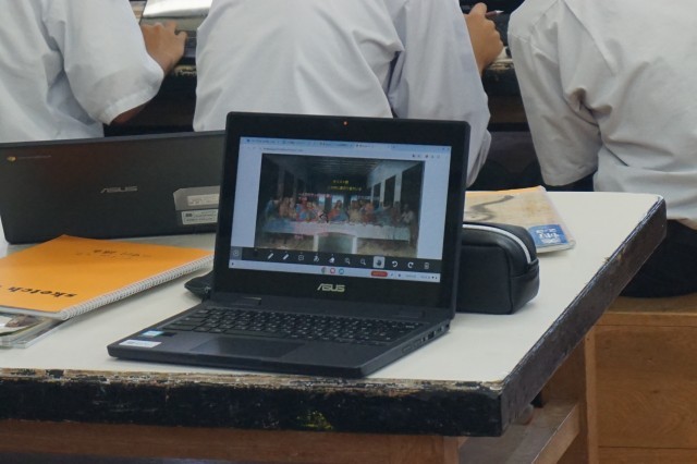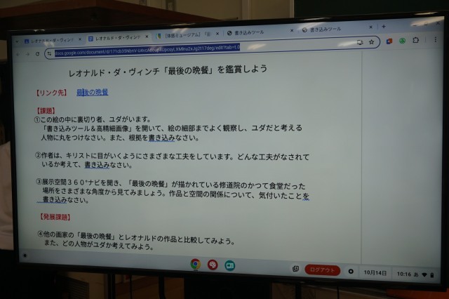 2年生の美術では、鑑賞の授業が行われていました。今日は学習用端末を用いて、レオナルド・ダ・ヴィンチの「最後の晩餐」を鑑賞しました。「作者がキリストに注目させるためにどんな工夫をしているか」について、生徒たちは自分の考えを端末に書き込み、互いに見合うことで見方や感じ方を共有し合いました。