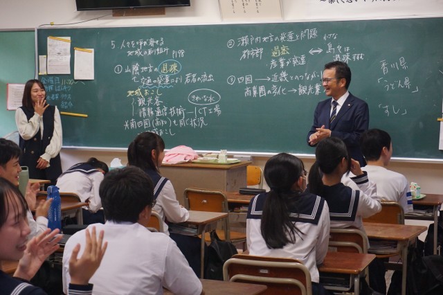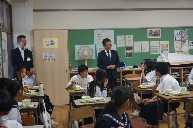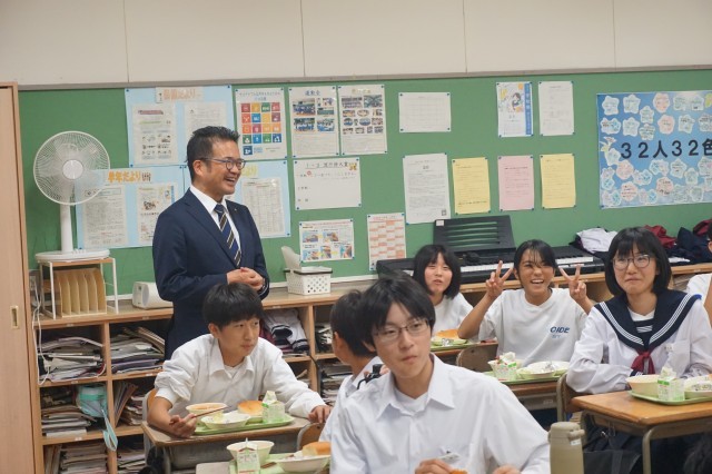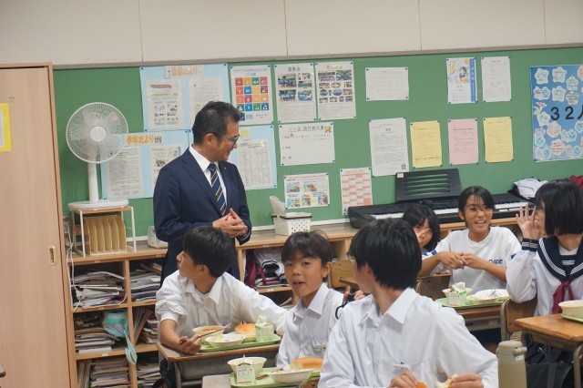 出町市長がお昼の時間に来校され、多くのクラスを訪問して生徒たちと交流しました。生徒たちは、市長からの問いかけにも元気に対応しとても和やかな時間となりました。