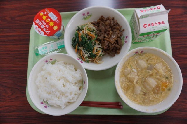 高岡元気ビビンバ丼、焼肉、ナムル、かきたま汁、ヨーグルト、牛乳