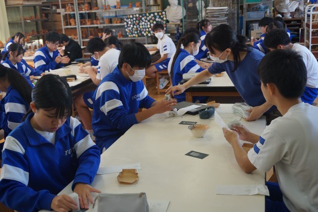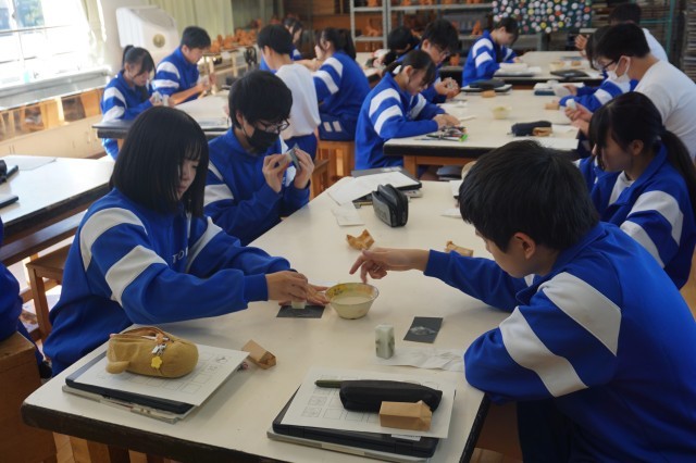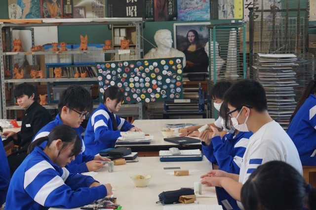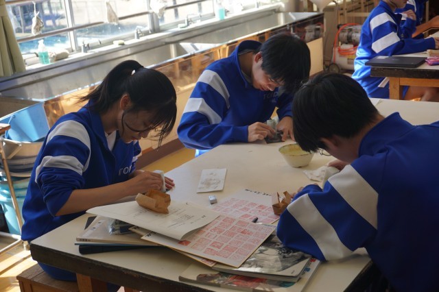 3年生の美術では「自分を証明する印を作ろう」という課題に挑戦しています。今日は、耐水ペーパーを使って、印面を平らにする作業に取り組んでいました。生徒たちは、黙々と自分の作業に没頭しており、仕上がりが楽しみです。