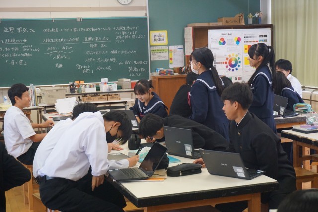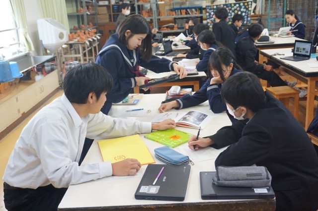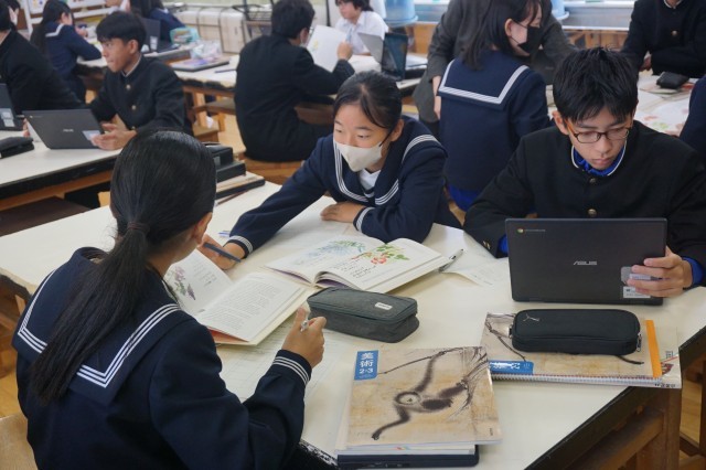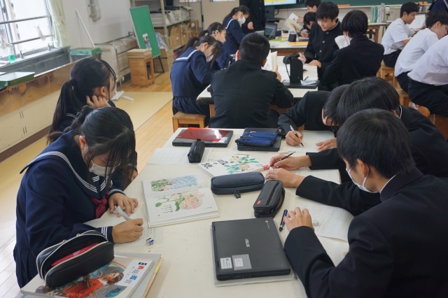 2年生の美術では、鑑賞の授業が行われていました。事故で首から下を全く動かすことができなくなった星野富弘さんが、口に筆をくわえて描いた作品を鑑賞しながら、感想をシートに書きました。生徒たちは、たくさんある星野さんの作品の中から、特に印象を受けた作品を選んで、感じたことをまとめていました。