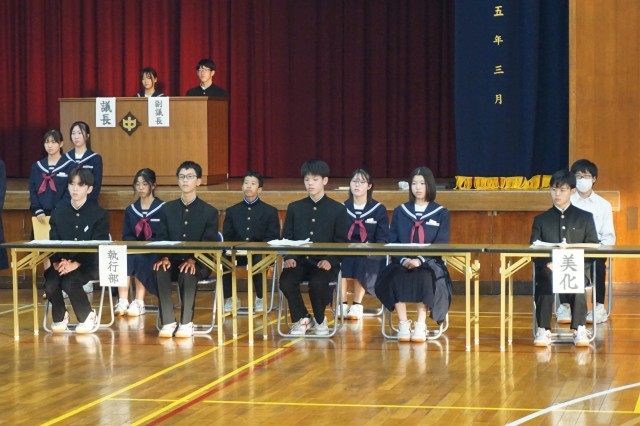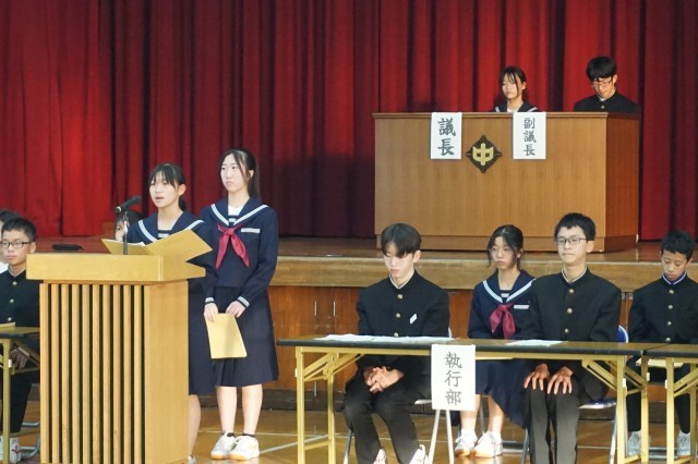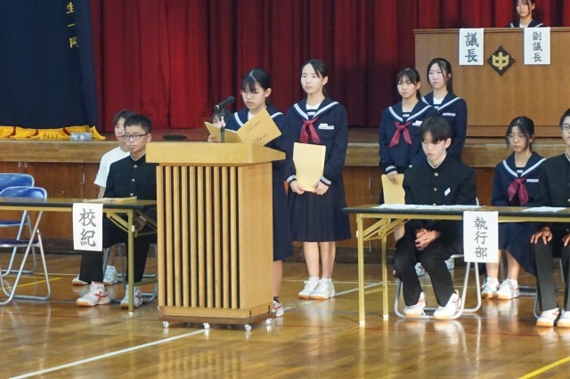 放課後の時間を利用して、明日の生徒総会のリハーサルが行われていました。生徒会執行部が中心となり、考えた活動方針案の説明の練習に真剣に取り組んでいました。どの生徒もしっかりとした態度で臨んでおり、とても頼もしく感じました。