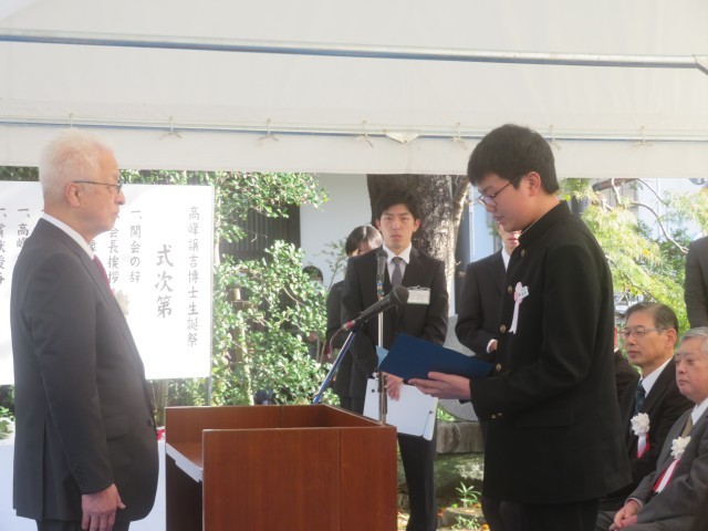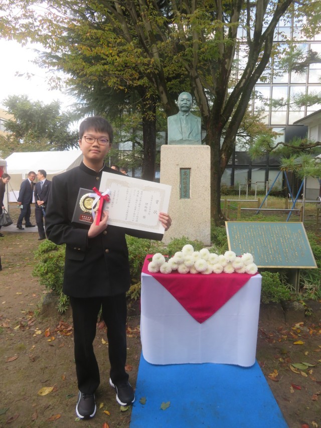 11月3日、文化の日に、「高峰譲吉博士生誕祭」が行われ、本校理科部の研究が高峰譲吉科学賞を受賞しました。理科部代表として部長が出席し、高峰博士像への献花をしたり高峰科学賞の受賞挨拶をしたりするなど、郷土の偉人である高峰博士の功績を間近に感じるよい機会となりました。今後の理科部も、高峰博士のような粘り強い研究活動を目指して頑張ります。