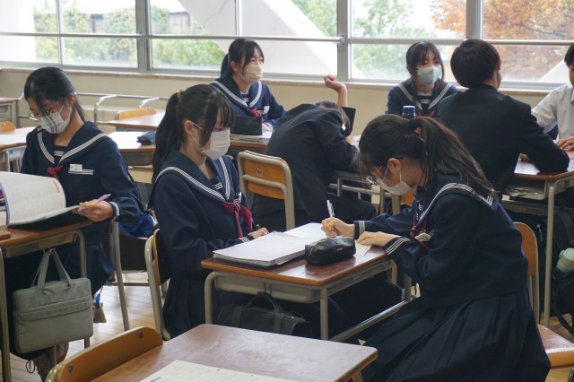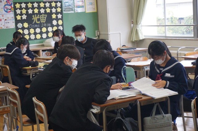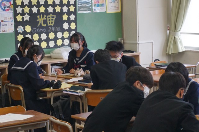 2年生の英語は、ALTの先生が出題する問題をこれまで学習した文法を駆使しながら解答する活動に取り組んでいました。今回は、比較表現を活用しながら、日本語の文を英語に翻訳しました。生徒たちは、クラスメートと協力して、正確な英文を作成しようと頑張っていました。