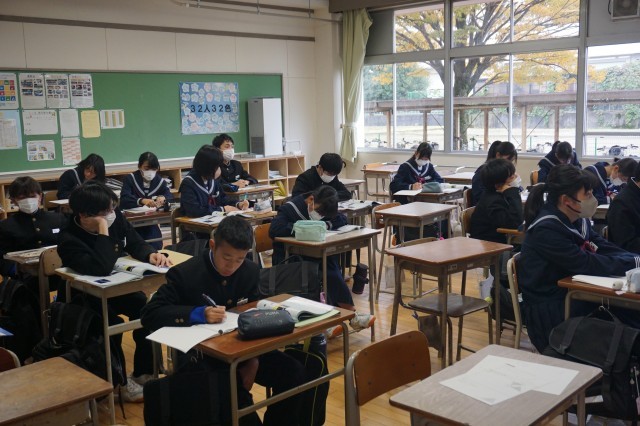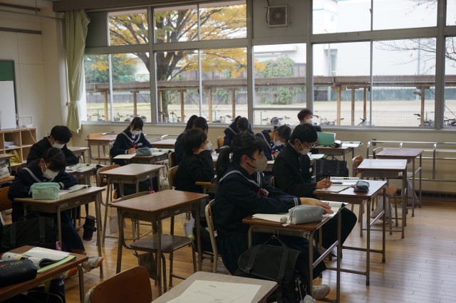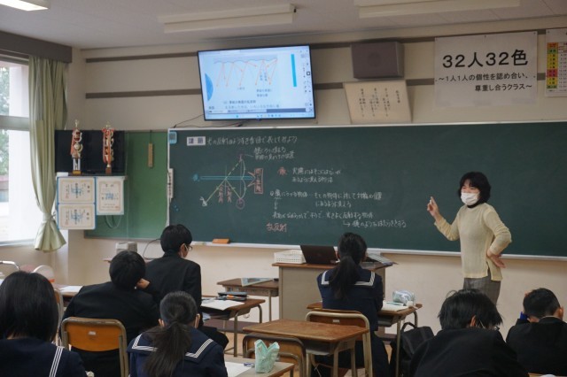 1年生の理科では、「光の反射」について学習していました。物体が光の反射で見える様子について、図で表すとどうなるかについて学びました。反射角、入射角、乱反射等、専門的な用語が出てきましたが、生徒たちは頭の中でその様子をイメージしながらしっかりと説明を聞いていました。