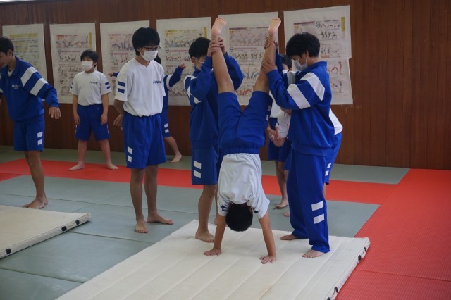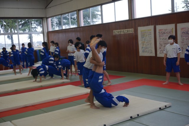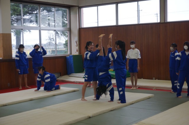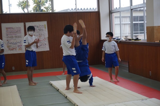 1年生の体育では、マット運動に挑戦していました。今日はクラスメートに補助をしてもらいながら、倒立前転のコツをつかめるように練習しました。最初はおそるおそる取り組んでいる生徒も多かったですが、少しずつ滑らかな体の動きができるようになってきました。