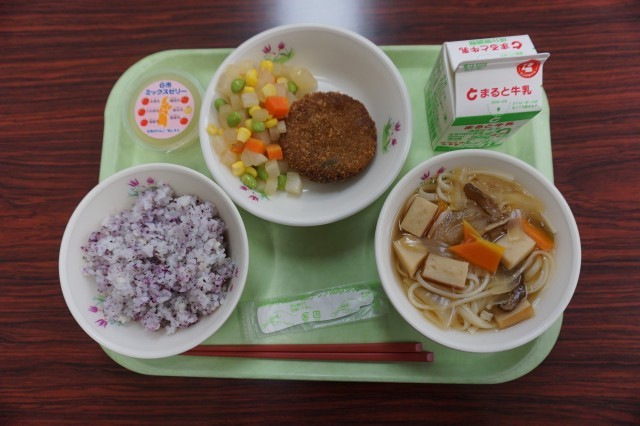 ハト麦入りしそご飯 ゴーセイなメンチカツ 枝豆サラダ 氷見うどん汁 6市ミックスゼリー 牛乳