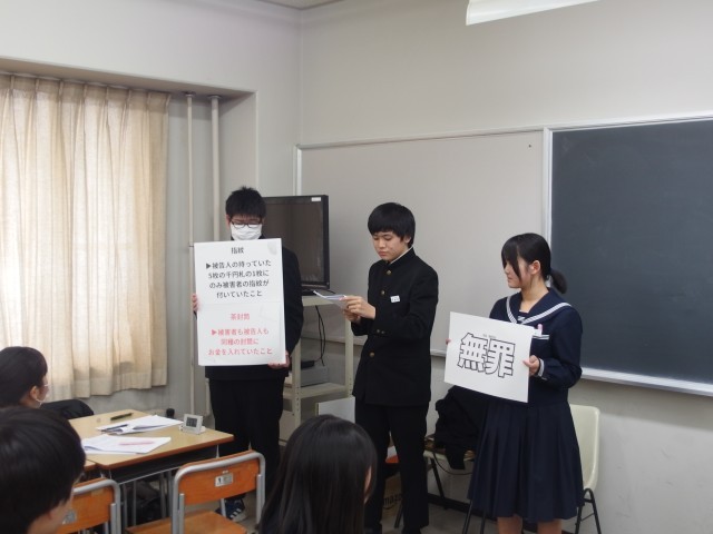 今日は3年3組が高岡法科大学で模擬裁判を行いました。裁判長、検察官、弁護人、被告人を演じた生徒たちの気持ちの込もった演技が素晴らしかったです。クラス全体での評議では、主張あり、反論あり、白熱した議論が交わされました。楽しみながら裁判のしくみを学習することができました。