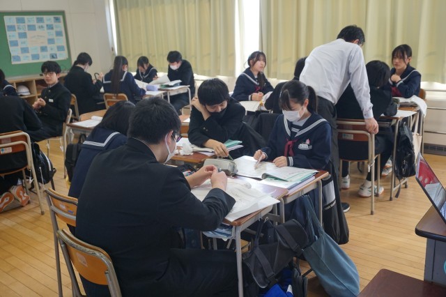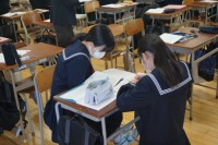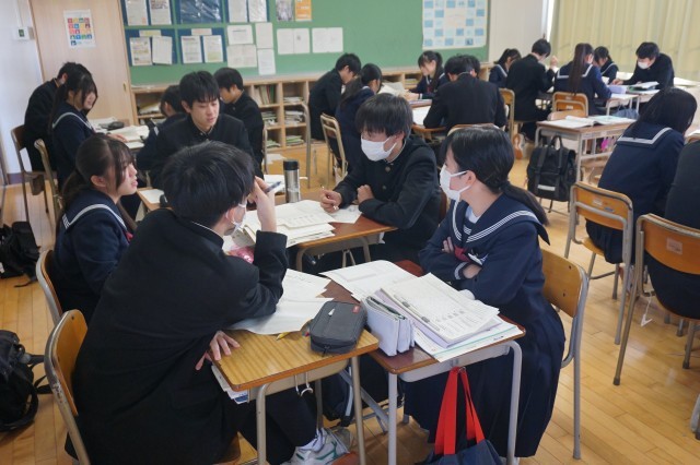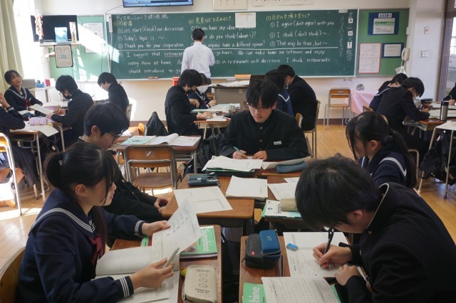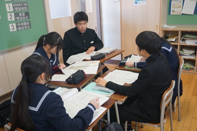 3年生の英語では、ディスカッションで用いる英語表現を学習し、実際にテーマを決めて英語でのディスカッションに挑戦しました。司会役、発表役等の役割を変えながら、班で取り組みました。生徒たちは、自分の意見や、反対・賛成等の自分の立場を言う時に、学習した内容を活用しながら真剣に取り組んでいました。