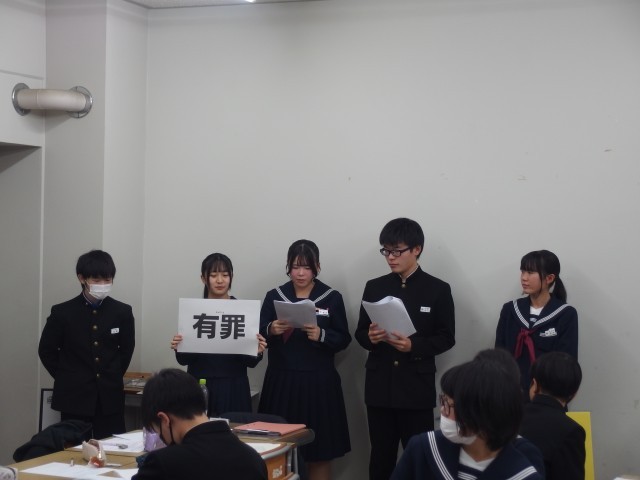 今日は3年2組が高岡法科大学で模擬裁判を行いました。架空の刑事事件を題材に役割演技を行いました。評議では1つ1つの証拠を丁寧に分析し、1人1人が考えををもって活動に取り組んでいました。今日も活発な議論が交わされ、有意義な学習となりました。
