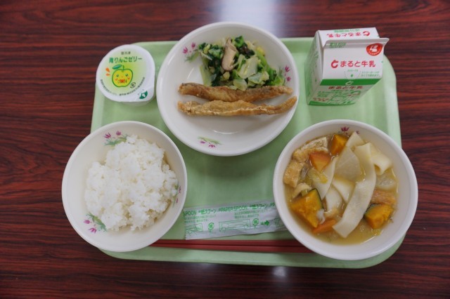 減量ご飯 ししゃもフリッター 青菜と生シイタケの浸し ほうとう鍋 青りんごゼリー 牛乳