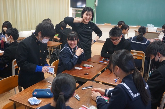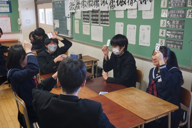 3年生の教室では、学級活動の時間にカードゲームを用いたレクリエーションが行われていました。日頃は受験生として勉強中心の3年生ですが、班員と一緒に楽しく活動して和やかな時間を過ごすことができたようでした。
