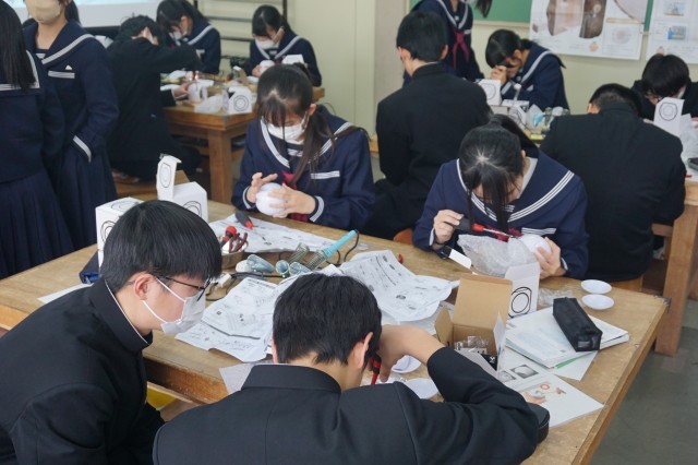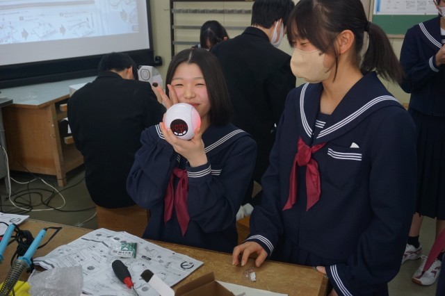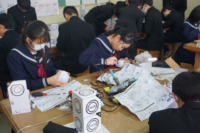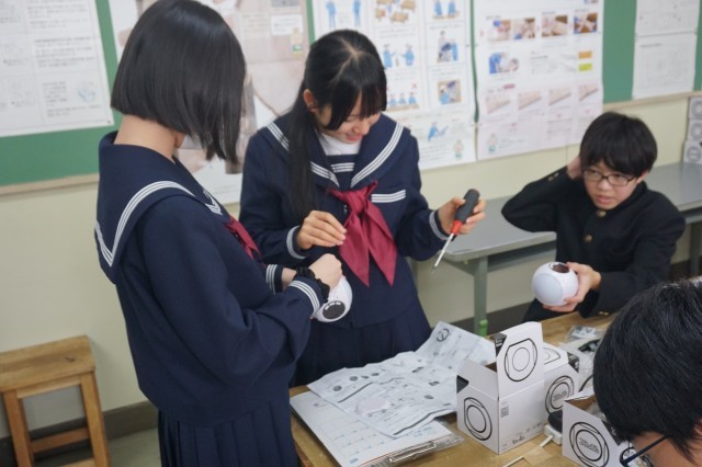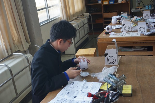 3年生の技術では、2学期から「コロックル」というキットを制作しています。基板へのはんだ付け作業等も終了し、いよいよ完成目前です。一足早く仕上がった生徒は、電池を入れて動作確認をすると光や音の反応があり、大変喜んでいました。