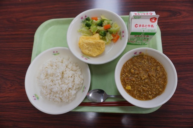 麦ごはん ハート型オムレツ きゃべつサラダ 大豆ミート入りキーマカレー 牛乳