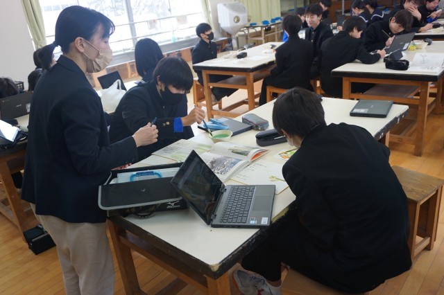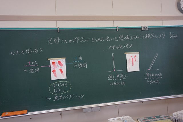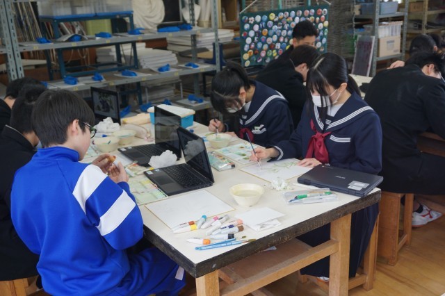2年生の美術では、画家の星野富弘さんの作品の模写が行われていました。水や絵の具の組み合わせで、にじみやぼかしを取り入れたり、筆の向きを垂直や寝かせるなど工夫して線の太さを変えたりするなど、どの生徒も真剣に取り組んでいました。