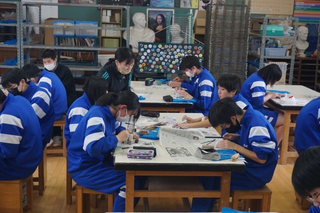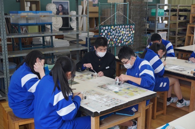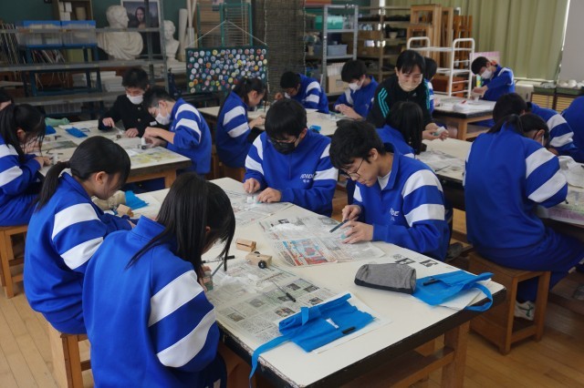 3年生の美術では、自分を証明する「印」の制作をしています。今日は、自分の思いや願いを込めた「持ち手」を作りました。生徒たちは、金のこぎりや金やすり、サンドペーパーを使いながら、自分のイメージする持ち手を完成させようと、黙々と作業に取り組んでいました。