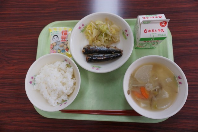 ごはん 鰯の梅煮 キャベツともやしの和え物 団子入りゴマみそ汁 節分豆 牛乳