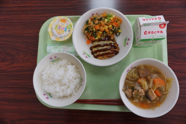 今日は、高岡B級グルメの一つ「ととまる」が出ました。「ととまる」の「トト」とは、富山県の方言で「魚」のことです。魚のすり身を丸く平らにして焼いたものが「ととまる」です。この高岡流お好み焼きには、作るための条件が2つあります。一つ目は、鉄板で焼くこと。2つ目は、昆布をお好み焼きに入れること、です。魚のうまみと昆布のうまみが合わさって美味しくなります。給食の「ととまる」は「高岡流お好み焼き にこにこととまる」と名付けられています。「にこにこ」とは、人参、米粉、ニラ、昆布の頭文字で、地域でとれた食材が入っています。今日も美味しくいただきました。