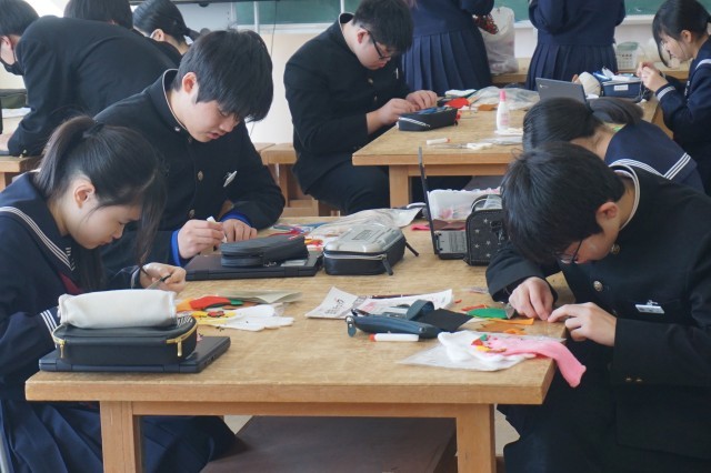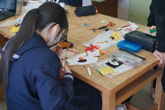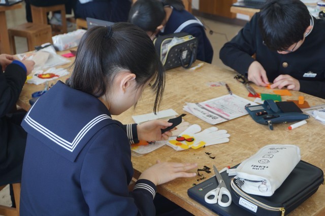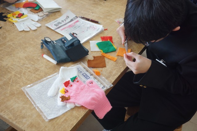 3年生の家庭科では、指人形の制作が行われていました。軍手の指先に、フェルトの布を用いて飾りつけをします。細かい作業ですが、どの生徒も真剣に取り組んでおり、かわいい作品が仕上がりそうです。