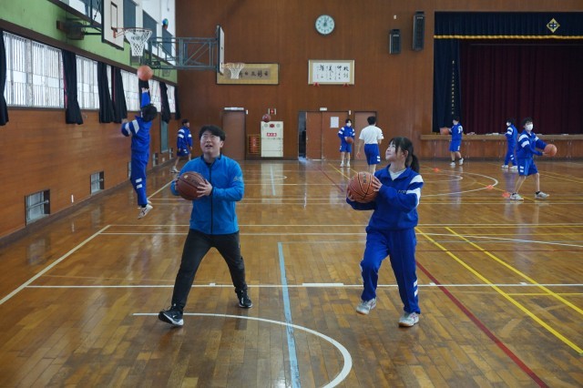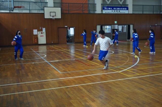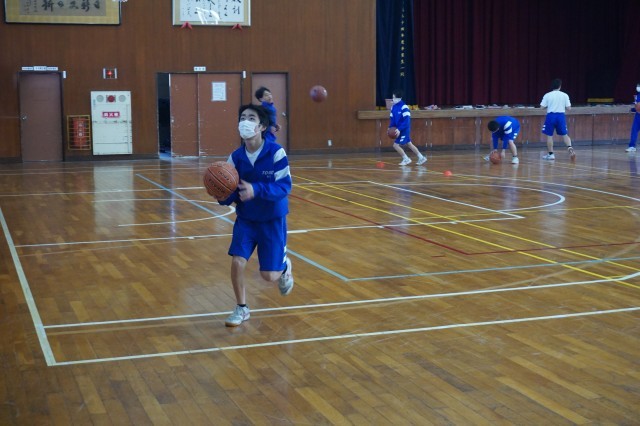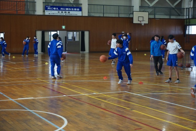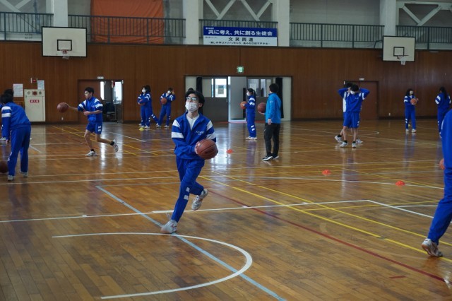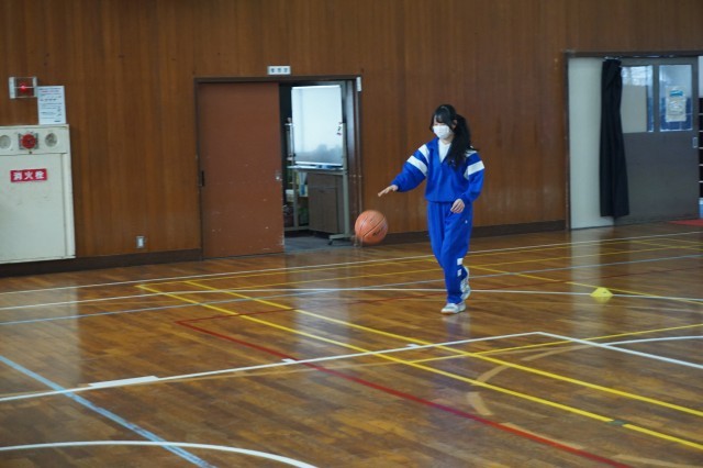 2年生の体育では、バスケットボールの授業が始まっています。今日は、ランニングシュートの練習が行われていました。生徒たちはドリブルの勢いのまま、シュートにつなげる足の運びを何度も練習していました。