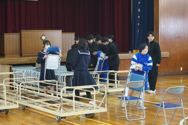 卒業式に向けて、2年生が中心となり体育館の式場設営を行いました。紅白幕を吊ったり卒業生や保護者用の座席を設置したりしました。この準備からいよいよ2年生が最上級生として活動していきます。心に残る卒業式を目指して頑張ってほしいと思います。