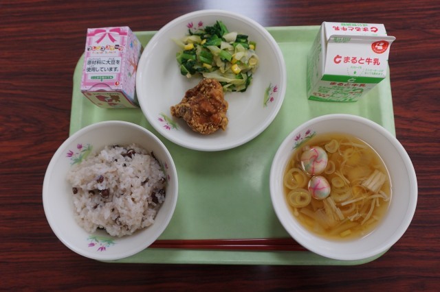赤飯 鶏肉の香り揚げ 小松菜のコーンあえ 手毬麩の清汁 お祝いデザート 牛乳