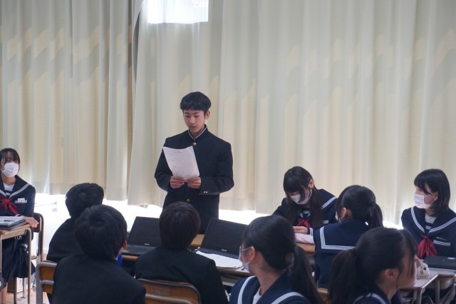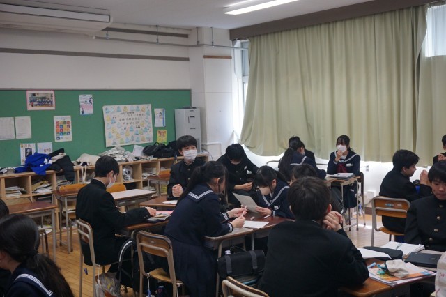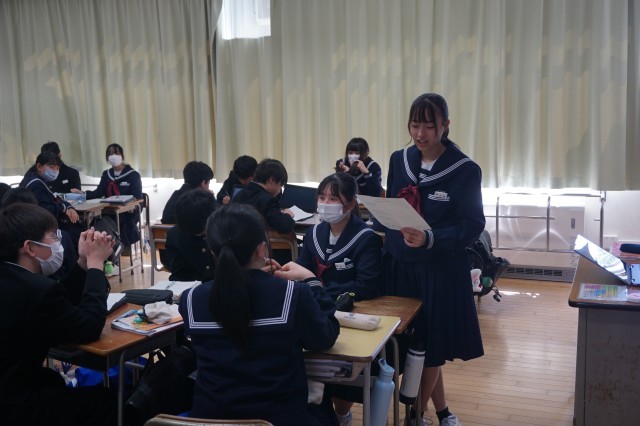 1年生の英語では、スピーチの発表会が行われていました。この1年間を振り返り、思い出に残った学校行事についてグループ内で発表し合いました。今週いっぱいで今年度の授業が終了しますが、しっかりと締めくくりをして来年度につなげてほしいと思います。