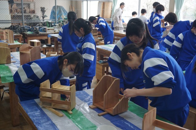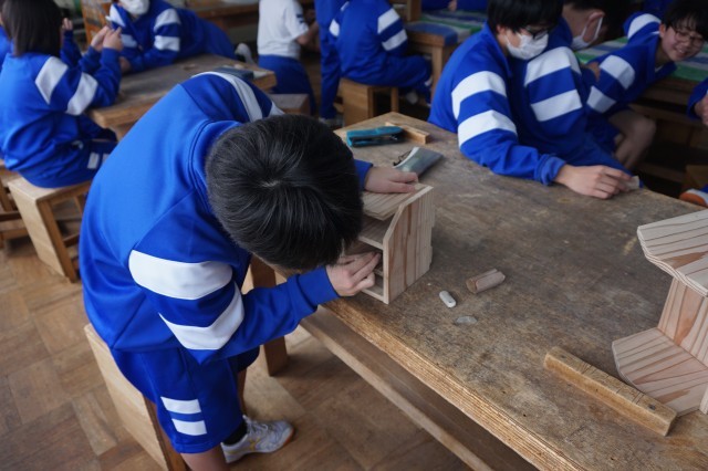 1年生の技術で製作してきた本棚が今日で完成しました。今日の授業では、やすりで表面を滑らかにしたり、ニスを塗ったりするなど、最後の工程を仕上げました。出来上がった作品をみると、それぞれ個性があふれるものになっていました。
