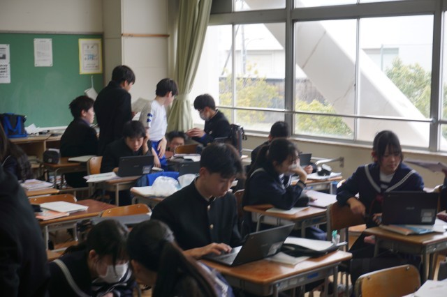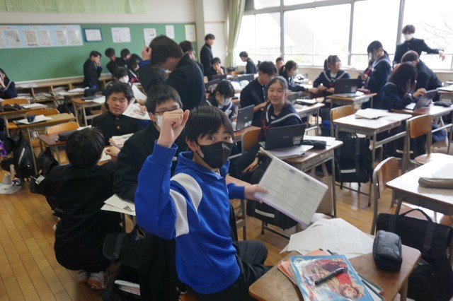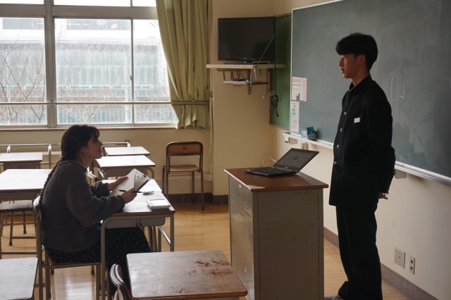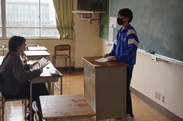 2年生の英語では、ALTの先生との対話テストが実施されていました。まずは、教室で何度も練習を重ねてから、別室でALTと英語で対話やスピーチを行いました。テストの内容は、簡単な日常会話に加え、「My Hero」というテーマで、自分の「推し」についてのスピーチでしたが、どの生徒も練習の成果を発揮して、堂々と対話していました。