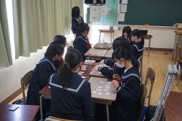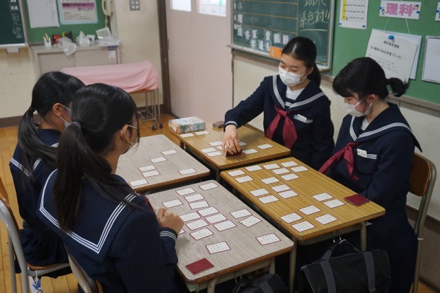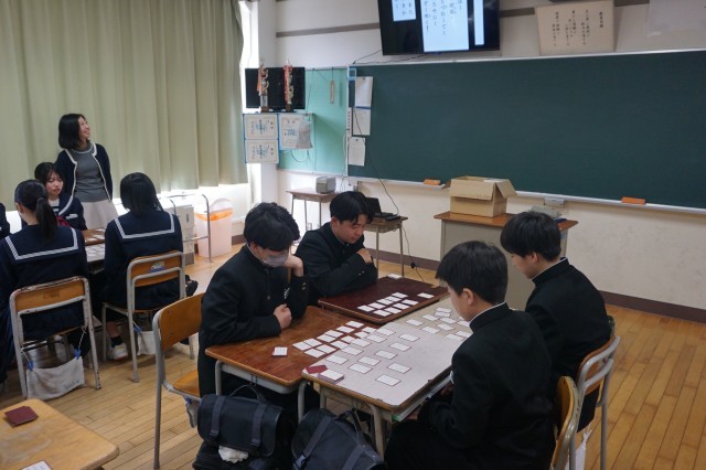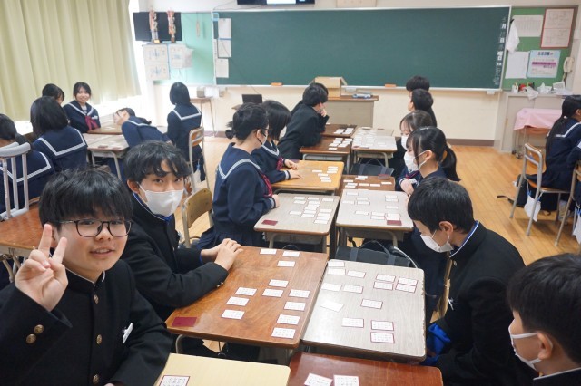 1年生の国語では、百人一首の「かるた」が行われていました。生徒たちは、学習専用端末から読み上げられる音声を聞き、グループごとに「かるた」を楽しみました。モニターには、読み札や取り札の画像が写し出されており、生徒たちは画像も確認しながら、できるだけたくさん札を取れるようがんばっていました。