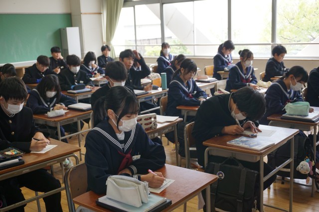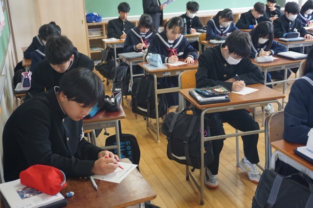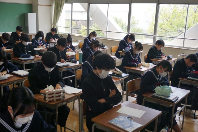 2年生の数学の授業では、これまで学習した知識や技能を活用しながら復習の計算プリントに取り組んでいました。どの生徒も真剣に活動に取り組み、学習への意識の高さが感じられました。