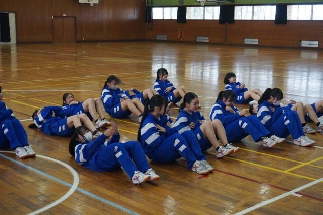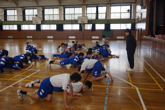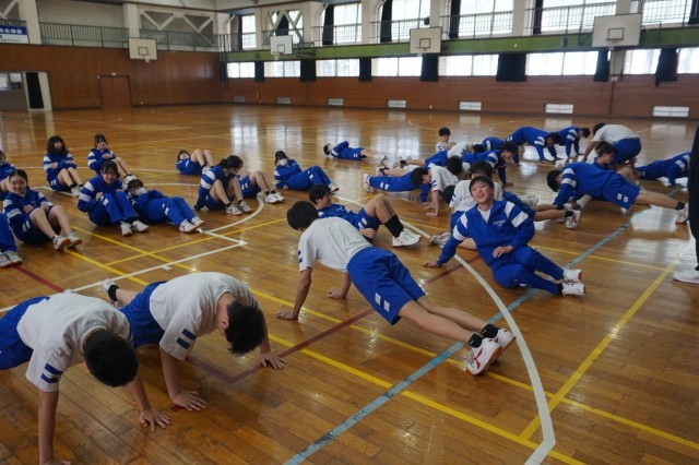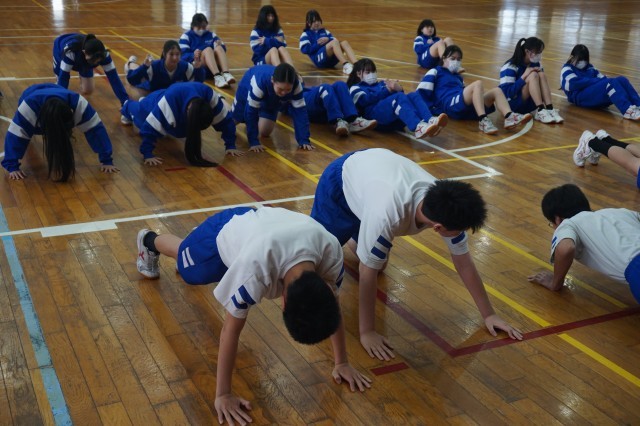 体育の授業では、体づくり運動として、腹筋や腕立てのトレーニングが行われていました。生徒たちはクラスメートと励まし合いながら、つらいトレーニングにも真剣に取り組んでいました。