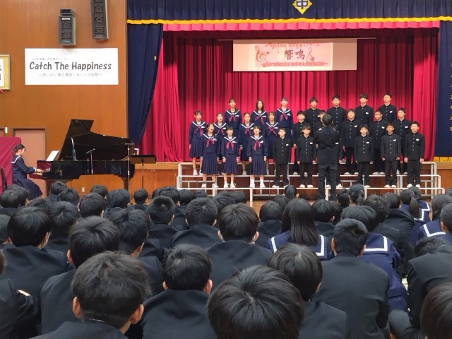 1年生の部は、出演順に、2組「大切なもの」、3組「マイ バラード」、1組「明日へ」を披露しました。どのクラスも強弱をつけ、元気な歌声を聴かせてくれました。