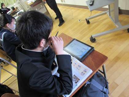 今日は、3年1組の社会科授業を参観する先生方の校内研修がありました。学習専用端末(タブレットPC)を一人一台使用しての授業です。参観される先生方が多く、密を避けるため、廊下にモニターも設置してあります。