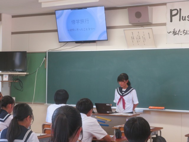 3年生は、総合的な学習の時間に、修学旅行についての学習成果の発表会を行いました。